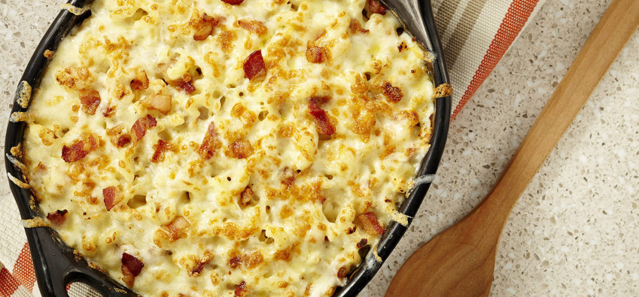 Transfer to a greased 13-in. x 9-in. (33 x 23 cm) baking dish. Top with remaining bacon and cheese. Bake for 20 minutes or until bubbling and golden.