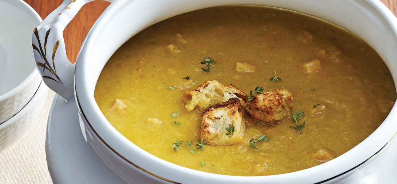 Use an immersion blender to purée soup until smooth. Stir in ham, lemon juice and thyme. Heat soup on low heat, 3 to 4 min., or until ham is warmed through. If soup is too thick, stir in an extra ½ cup (125 mL) to 1 cup (250 mL) water. Serve topped with croutons, if desired.